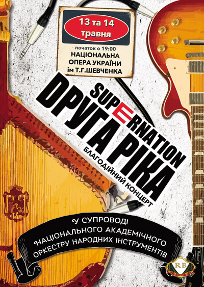 Компания RB Group приглашает Вас на самое грандиозное событие этой весны – невероятный концерт группы «Друга ріка» в сопровождении Национального оркестра народних инструментов Украины. Презентация абсолютно нового альбома легенды украинского рока с уже 20-летней историей - «SUPERNATION». Состоится концерт в красивейшем зале - Национальной оперы Украины им. Т.Г. Шевченко. Кстати, это впервые в Украине будет концерт такого уровня, в сопровождении больше, чем 30-ти народных украинских инструментов. А это - не просто оркестр это настоящие профессионалы своего дела. Только представьте себе, как будет звучать сочетание электрогитары с электробандурой и неподражаемый голос Валерия Харчишина! Это будет нечто Невероятное!! 2 часа качественного рока, полного драйва и 100%-живого звука. Название альбома говорит само за себя – СУПЕРНАЦИЯ!!!