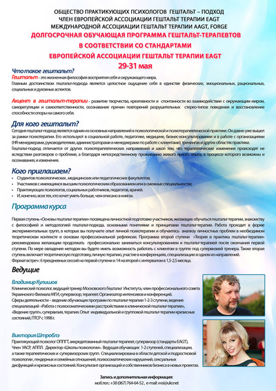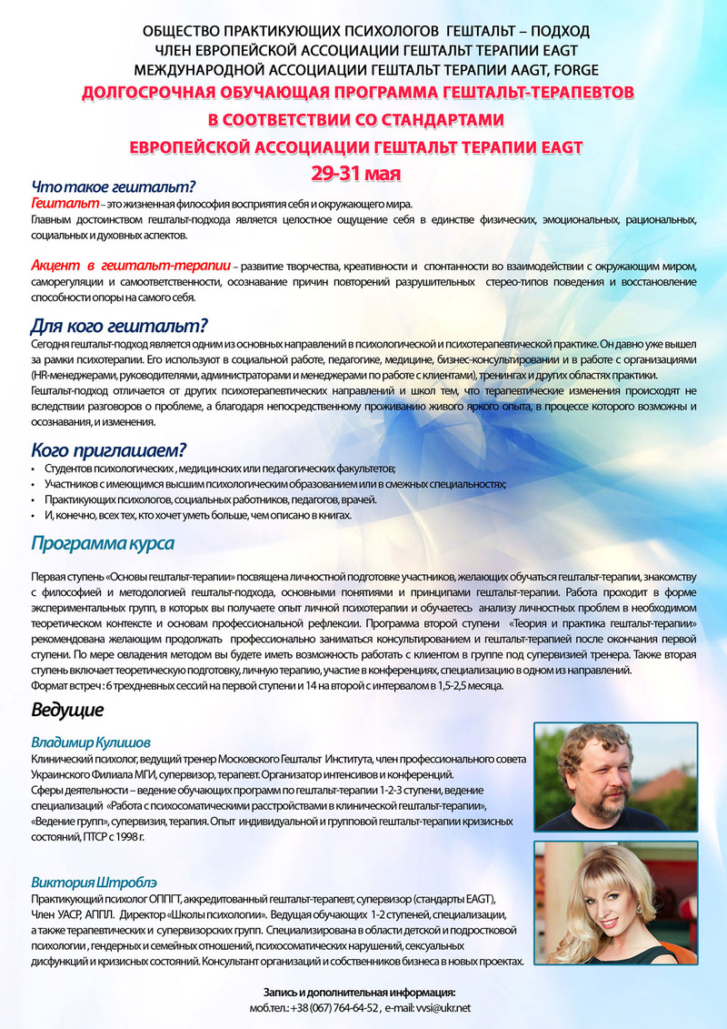 Долгосрочная обучающая программа гештальт-терапевтов в соответствии со стандартами европейской ассоциации гештальт-терапии EAGT.