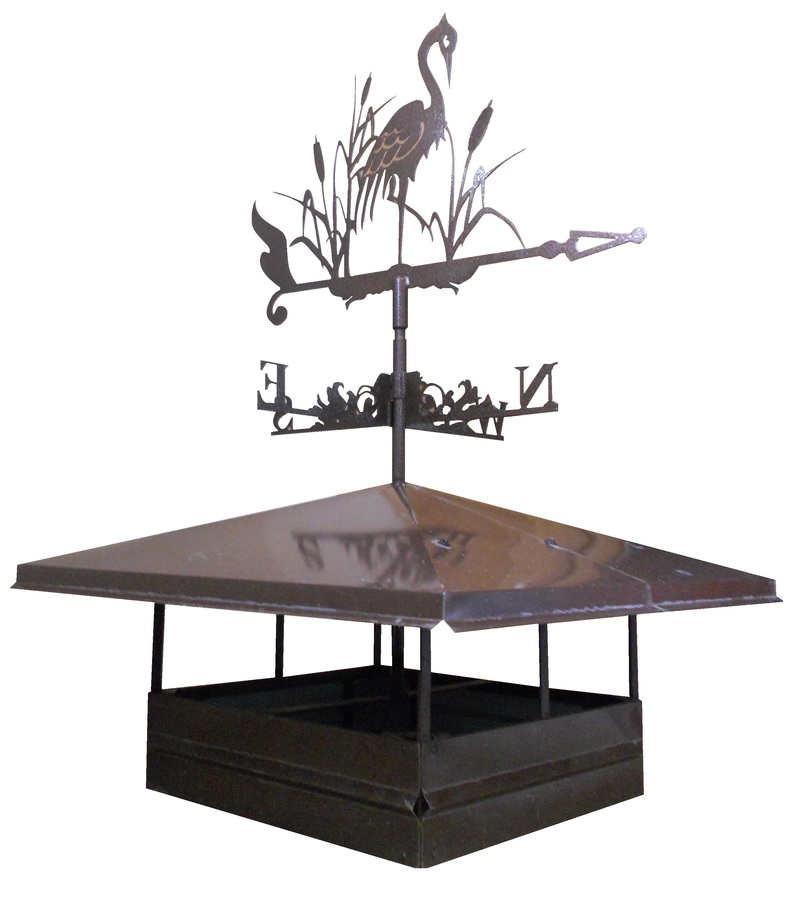 Если вы хотите флюгарку по дешевле, Вам скорее всего подойдет изделие из оцинкованной или крашеной жести толщиной 0,5мм в стандартном исполнении с соблюдением основных геометрических параметров. Те кто выбрал флюгарку из оцинкованной стали могут сдать её на покраску или покрасить самостоятельно. Монтаж такой флюгарки не сложный. Он устанавливается на кирпичный дымоход и с помощью дюбелей крепится в кирпичную основу дымохода.Колпаки на дымоход производятся по стандартным и индивидуальным размерам заказчиков из горячеоцинкованной стали с полимерным покрытием по цветовой карте RAL.
