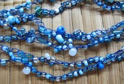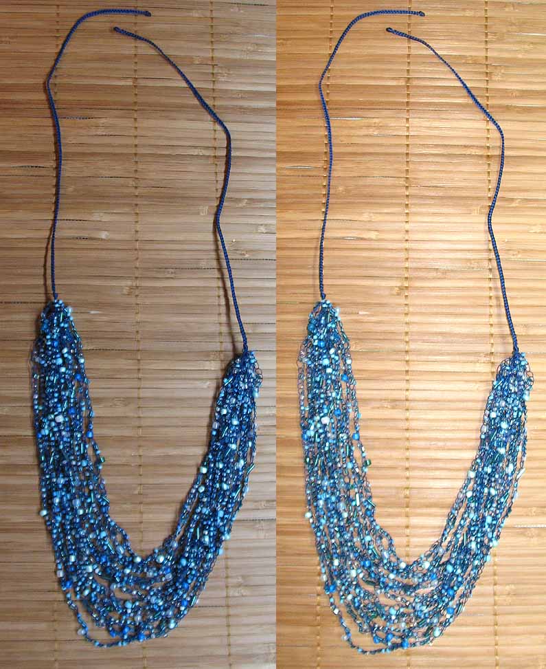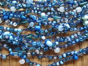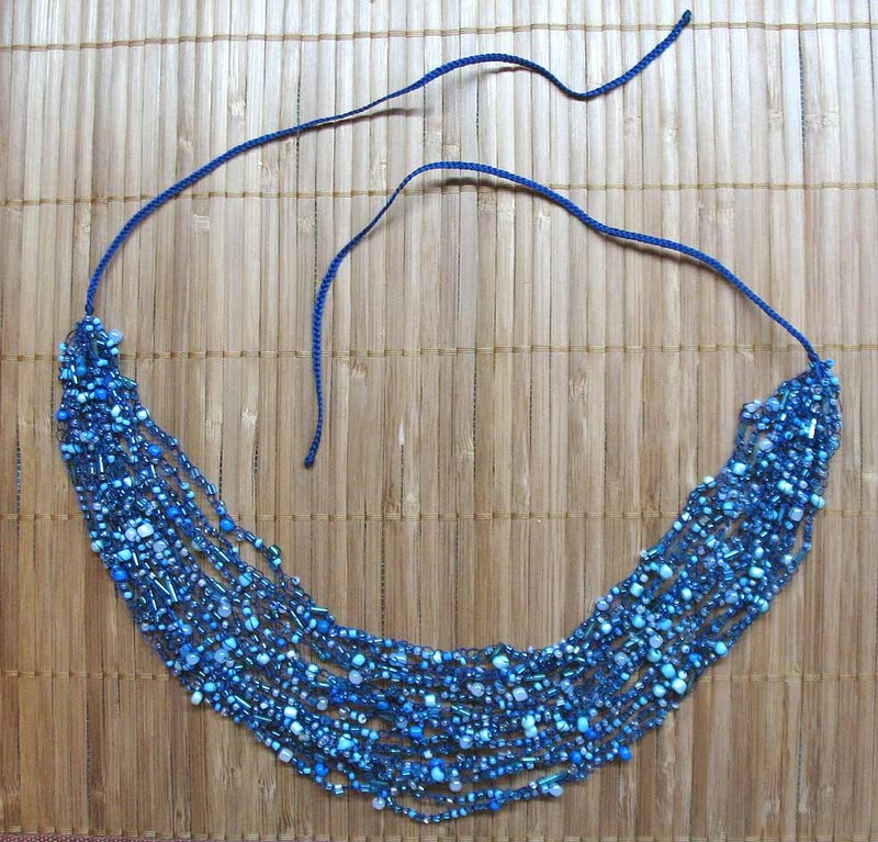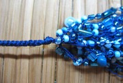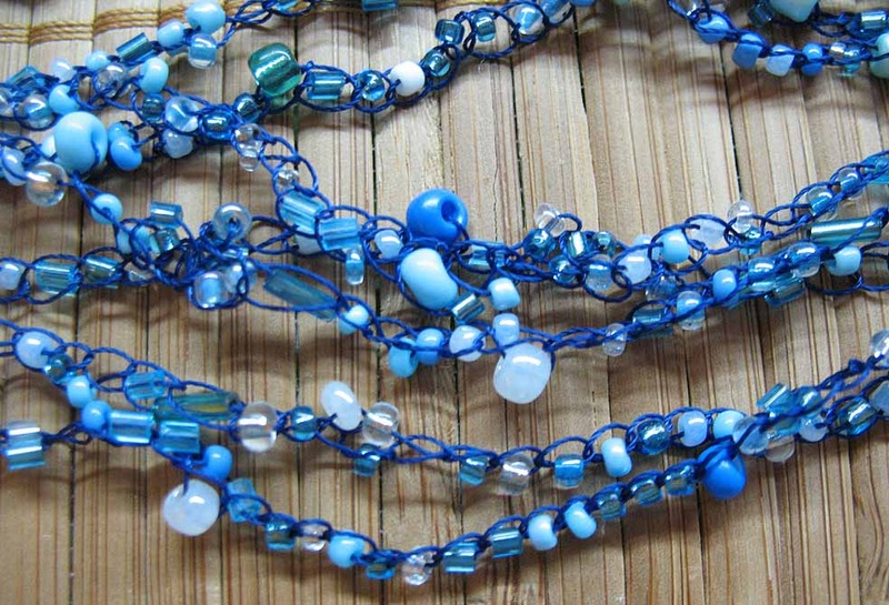 Цвет нити – темно-синий с легким оттенком фиолетового. Бисер пластиковый голубой – прозрачный и непрозрачный, синий, белый, а также с оттенком белого металла (максимально приближенная к реальности гамма – на укрупненном фото).