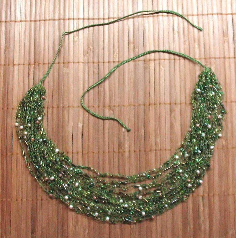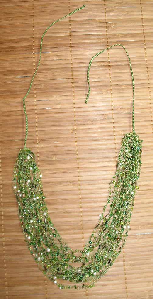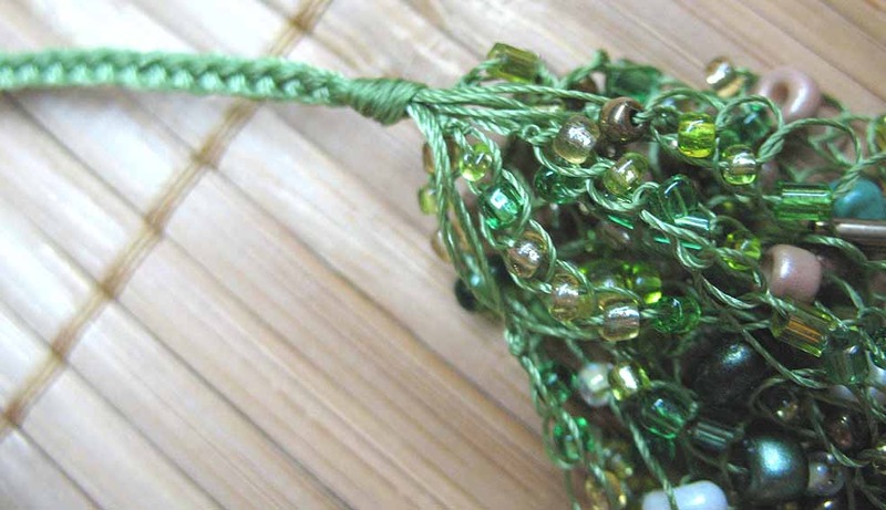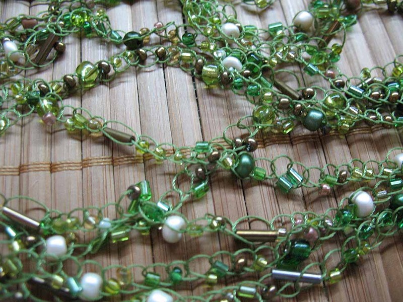 Цвет нити – фисташково-зеленый. Бисер пластиковый зеленый – прозрачный и непрозрачный, латунный, оливковый, белый (максимально приближенная к реальности гамма – на укрупненном фото).
