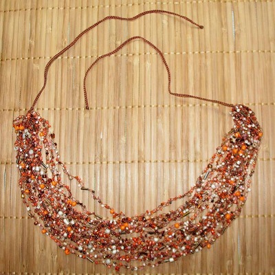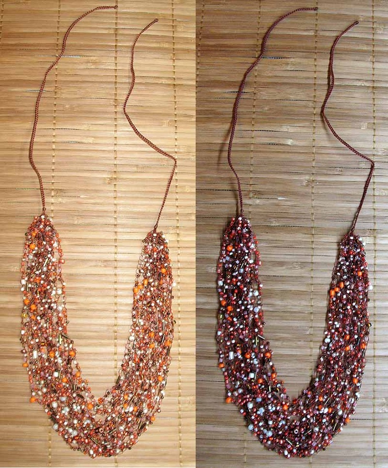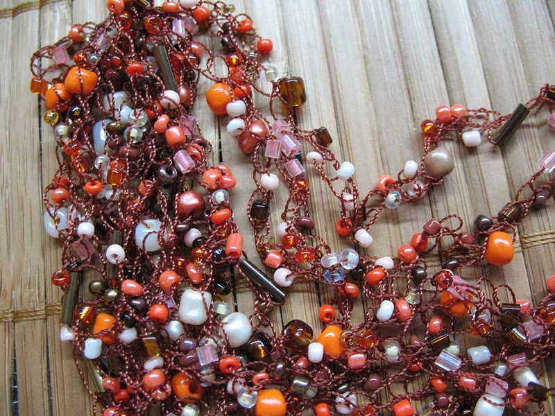Оттенок нити – глухой медно-коричневый. Бисер пластиковый медного оттенка, темно-оливкового, белый и все оттенки коричневого и оранжевого (максимально приближенная к реальности гамма – на укрупненном фото).