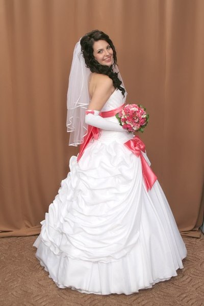 Очень красивое свадебное платье. Размер 44-46,но благодаря корсету я надевала на свой 42-й и была неотразима. Подойдет для девушки с не очень большой грудью и ростом 168-172 см + каблучок. Очень красивые ленты кораллового цвета и небольшая брошь на платье подчёркивают его простоту,элегантность и необычность. Без фатина,только подъюбник 2 кольца (можно надеть и без него,тогда можно выше каблук). Перчатки в подарок с такими же лентами. Девочки,кто не любит кучу страз,бусинок,фатин и блёсток- это платье подойдёт ИДЕАЛЬНО!!! |