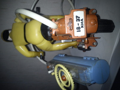ИГРУШКА мотоциклист на мотоцикле, ссср, металл+пластик, кабельное дистанционное управление, работает от двух больших круглых батареек. Новый. Производство - Киев, (арт.кг 085-181. Цена 9 крб.80 коп.) - надпись на двигателе. Гос.номер: 18-37 киа. |