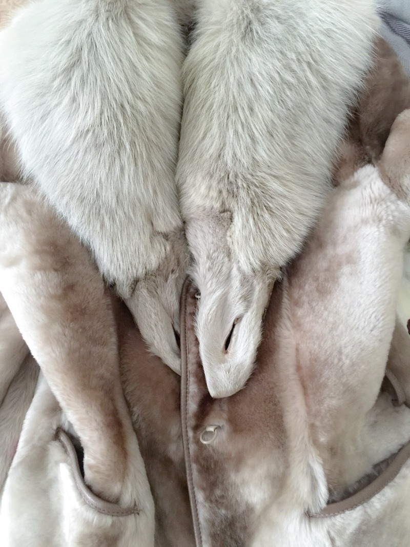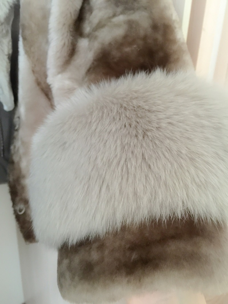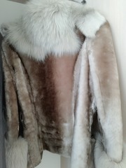 Мех:мутон, отделка - писец( воротник и рукава). Размер S 42-44. Очень теплый. Носился очень аккуратно. Серебристого цвета с переливами |