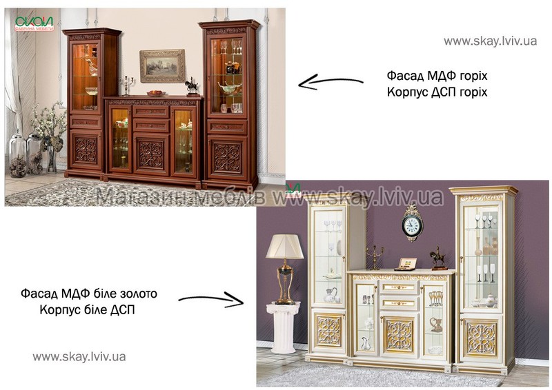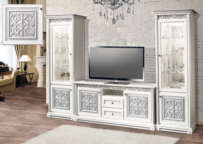Наборная система "Тоскана" (Скай, Украина), новая, в упаковке, конструкция на подиуме, корпус ДСП: белый, фасады МДФ резные, лакированные: белые с "золотом" и белые с "серебром", стекло и зеркало с фацетной обработкой, витрины и комод-бар оснащены подсветкой, приобретается по элементам. Мебель производится на современном высокотехнологическом оборудовании концерна HOMAG Group AG (Германия), с использованием исключительно высококачественной ламинированной ДСП, МДФ и имеет гарантию согласно ГОСТам Украины. ТУ У 36.1-34442700-001:2011.
