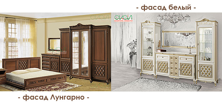 Наборная спально-гостиная система "Новита" (Киев, Украина), новая, в упаковке, корпус ДСП: орех "Караваджо" и белый, фасады МДФ резные, лакированные: орех "Лунгарно" и белый с "Золотом", зеркало с фацетной обработкой, размеры комплекта фото №1 (ШхВхГ): шкаф - 2,39 х 2,36 х 0,58м, кровать - 1,79 (1,99) х 2,08 х 1,06м. ( спальное место: 1,60 х 2,00м. и 1,80 х 2,00м.), комод 1-о дв. - 1,35 х 1,07 х 0,49м, прикроватная тумба: 0,51 х 0,55 х 0,47м, зеркало в раме - 1,09 х 0,72м. Приобретается по элементам (см. фото). Мебель производится на современном высокотехнологическом оборудовании концерна HOMAG Group AG (Германия), с использованием исключительно высококачественной ламинированной ДСП, МДФ и имеет гарантию согласно ГОСТам Украины. ТУ У 36.1-34442700-001:2011. Предоплата на карточку "Приват банка".