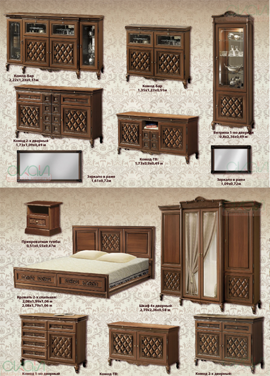 Наборная спальная система "Новита" (Киев, Украина), новая, в упаковке, корпус ДСП: орех "Караваджо", фасады МДФ резные, лакированные: орех "Лунгарно", зеркало с фацетной обработкой, размеры комплекта фото №1 (ШхВхГ): шкаф - 2,39 х 2,36 х 0,58м, кровать - 1,79 (1,99) х 2,08 х 1,06м. ( спальное место: 1,60 х 2,00м. и 1,80 х 2,00м.), комод 1-о дв. - 1,35 х 1,07 х 0,49м, прикроватная тумба: 0,51 х 0,55 х 0,47м, зеркало в раме - 1,09 х 0,72м. Приобретается по элементам (см. фото). Мебель производится на современном высокотехнологическом оборудовании концерна HOMAG Group AG (Германия), с использованием исключительно высококачественной ламинированной ДСП, МДФ и имеет гарантию согласно ГОСТам Украины. ТУ У 36.1-34442700-001:2011.