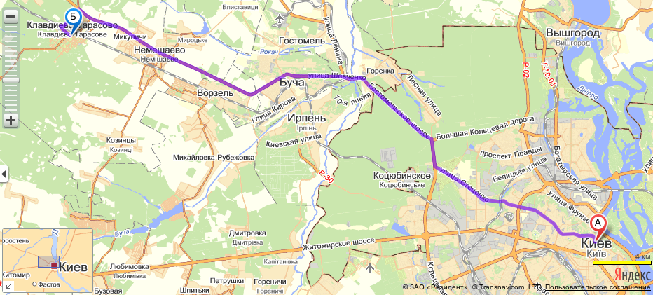 До электрички 10 минут пешком. Через каждых 15 минут идут маршрутки на Киев и электрички каждый час. 27,1 км от Окружной дороги по Варшавской трассе (М-07).