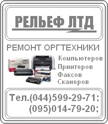 Ремонтируем офисную технику: компьютеры, принтеры, факсы, сканеры по доступным ценам. Заправляем картриджи для принтеров чёрно-белых и цветных. Мастерская расположена по адресу: г.Киев, ул.Алма-атинская 2/1, мастерская «РЕЛЬЕФ». Оперативность и качество работы гарантируем.Также осуществляем ремонт бытовой техники и электроники. тел. (044)599-29-71; (095)014-79-20; (096)257-42-00. Сайт: relyef.com |