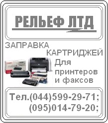 Заправляем картриджи и обслуживаем офисную технику по доступным ценам. При необходимости звоните, мы приезжаем, ремонтируем, оставляем счет фактуру, вы оплачиваете через любой банк, в течении трёх дней после ремонта, на расчётный счёт ООО «РЕЛЬЕФ ЛТД». Качество и оперативность гарантируем. Мастерская расположена по адресу: г.Киев, ул.Алма-атинская 2/1, мастерская «РЕЛЬЕФ». тел. (044)599-29-71; (095)014-79-20; (096)257-42-00. Сайт: relyef.com |