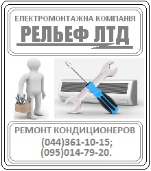 Предоставляем услуги по ремонту кондиционеров в Вашем доме, офисе, квартире. Качественно, оперативно, по доступным ценам. На свои работы даем гарантию. Так же предоставляем услуги по обслуживанию и установке кондиционеров. тел. (044)599-29-71; (095)014-79-20; (096)257-42-00. Сайт: relyef.com |