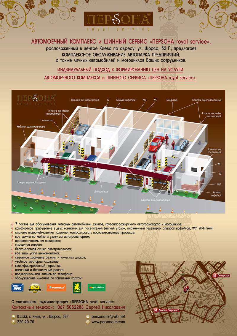 Автомоечный комплекс и шинный сервис "Перsона Royal Service", расположенный в центре Киева по адресу ул. Щорса, 32-Г, предлагает комплексное обслуживание автопарка предприятий, а также личных автомобилей и мотоциклов Ваших сотрудников.