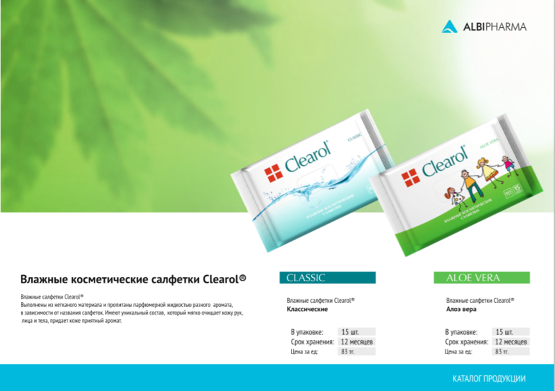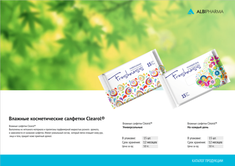 Компания - производитель «ALBI Pharma» ищет дистрибьюторов по территории Казахстана и стран СНГ для осуществления продаж средств личной гигиены высокого качества и приемлемой цены, а именно: антибактериальные гели, влажные салфетки, жидкое мыло, гель для душа, средство для мытья посуды брендов "Clearol", "Freshness", "Nature". В случае Вашей заинтересованности, мы сделаем все чтобы создать максимально комфортные условия сотрудничества. |