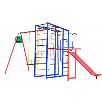 Комплектация: качели, горка, лесенка на горку, шведская стенка, рукоход, турник с широким и узким хватом, брусья, баскетбольное кольцо, комплект крепежей для бетонирования.