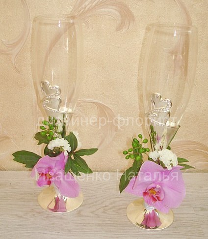 Украшение бокалов живыми или искусственными цветами. Оформим в стиль Вашей свадьбы, широкий выбор цветов и декора. Бокалы оформление от 120грн. |