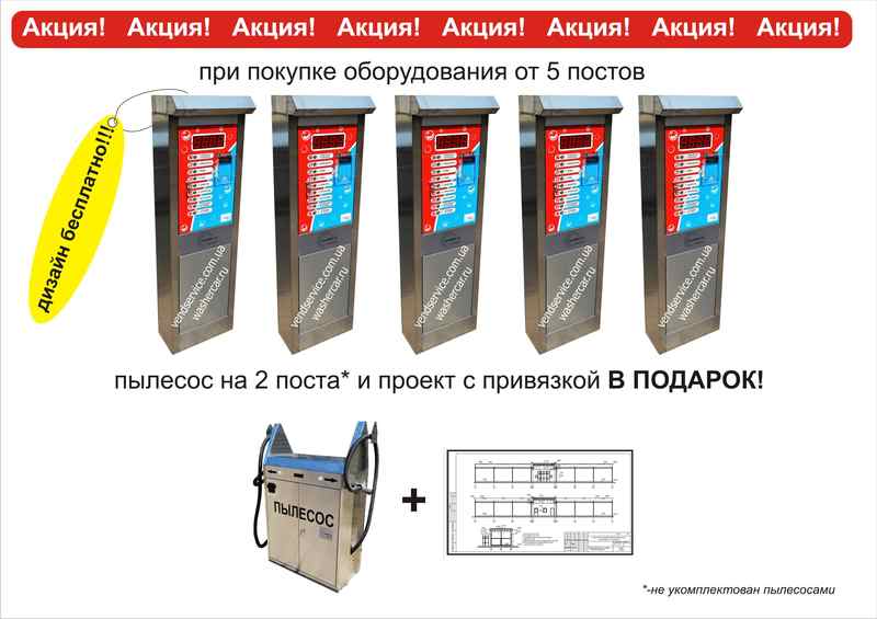 Компания Vendservice, реализует оборудование для автомоек самообслуживания высокого качества и по доступной цене. В данный момент действует акция. При покупке оборудования «ЛЮКС» минимум на 5 постов, Вы получаете проект, с привязкой к местности. А так же пылесос самообслуживания на 2 поста в подарок (комплектуется без пылесосов). Акция действует до 1.09.2015 Подробности по тел. |