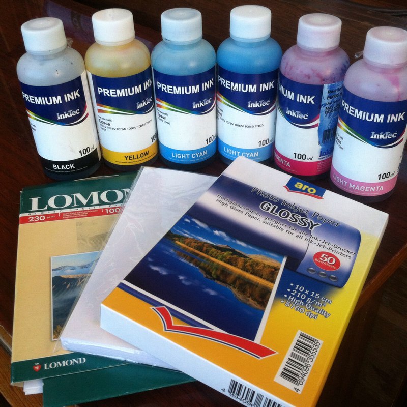 +в комплекте с принтером отдаю даром 6 неполных бутылька с краской разных оттенков, матовую и глянцевую бумагу для фотографий.