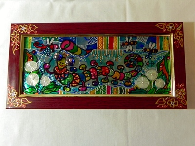 Размер живописного поля: 250 Х 100 (мм). Стекло витражное, бисер, стеклярус, дерево Витражная картина выполнена витражными красками и контурами по стеклу.Подарите себе частичку радости. Забавный и задорный сюжет порадует как детей, так и Вашего любимого человека. Ведь иногда так хочется от жизни ОТОРВАТЬСЯ:) Хорошо впишется в интерьер. Оригинальное сочетание растаманских лихих цветов вызовет бурю положительных эмоций даже в пасмурный день. Оригинал продан на арт-аукционе. Такую же работу в хорошей рамке 21х15 см выполню на заказ . Она будет даже интересней, с новыми деталями. Срок – 8 дней. |