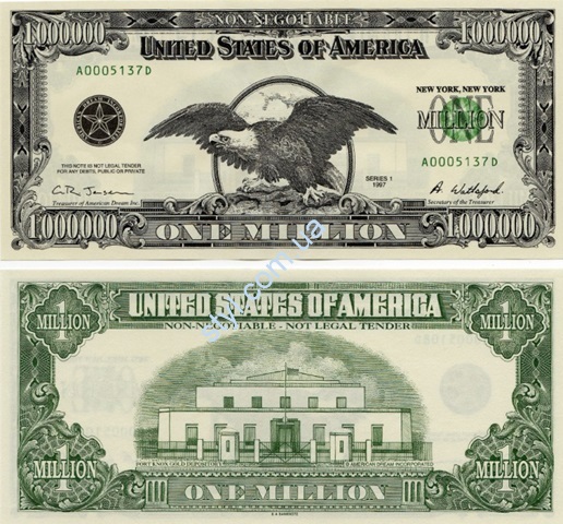 Хотя банкноты номиналом в 1.000.000 долларов отпечатаны на Монетном Дворе США и отвечают всем требованиям, которые предъявляются к обычным деньгам, в обороте они не участвуют и номинальной ценности не имеют. Другими словами - это не деньги! Подробнее на: