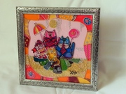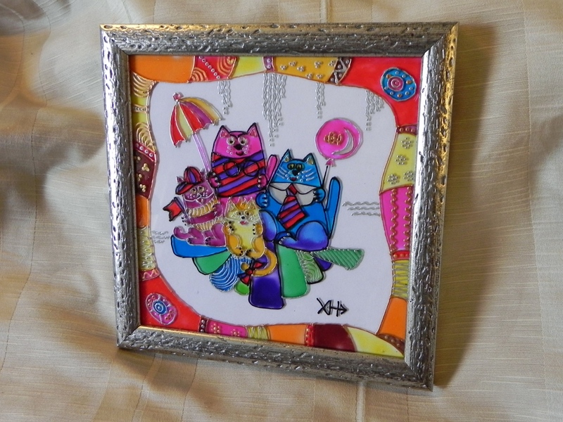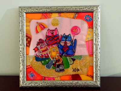 Серия «Кошкин Мир»: Семейный праздник. Размер живописного поля: 180 х 180 (мм) Витражная картина выполнена витражными красками и контурами по стеклу. Праздник в Кошачьем Мире! Возможный вариант: часть триптиха «Кошкин Мир». Элегантная приглушённо-серебристая рамка завершает работу. |