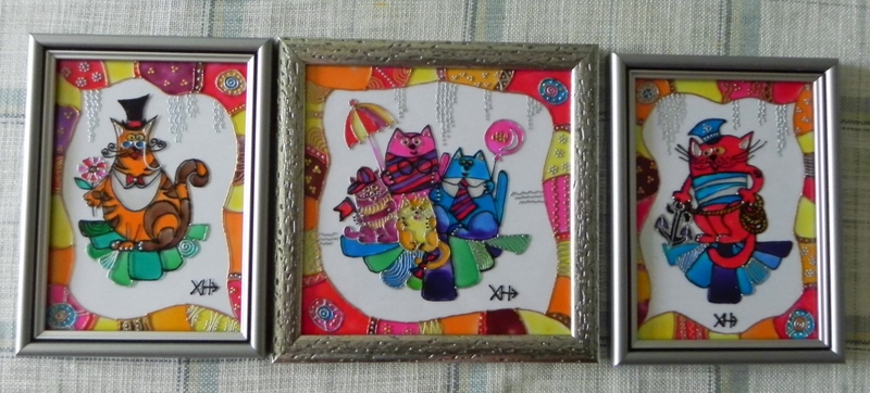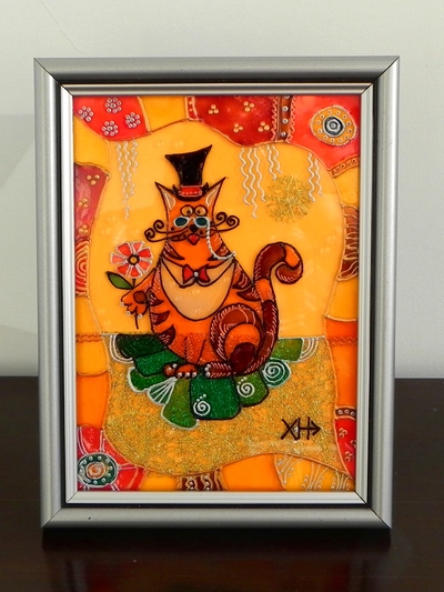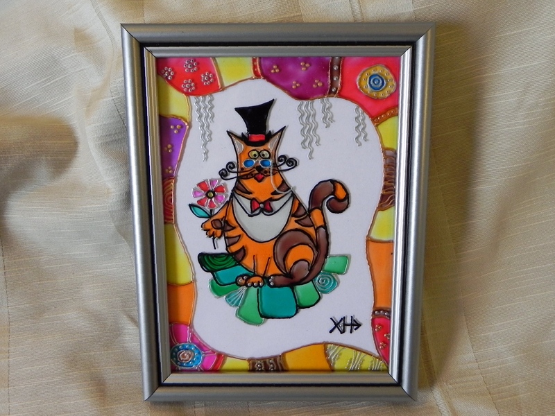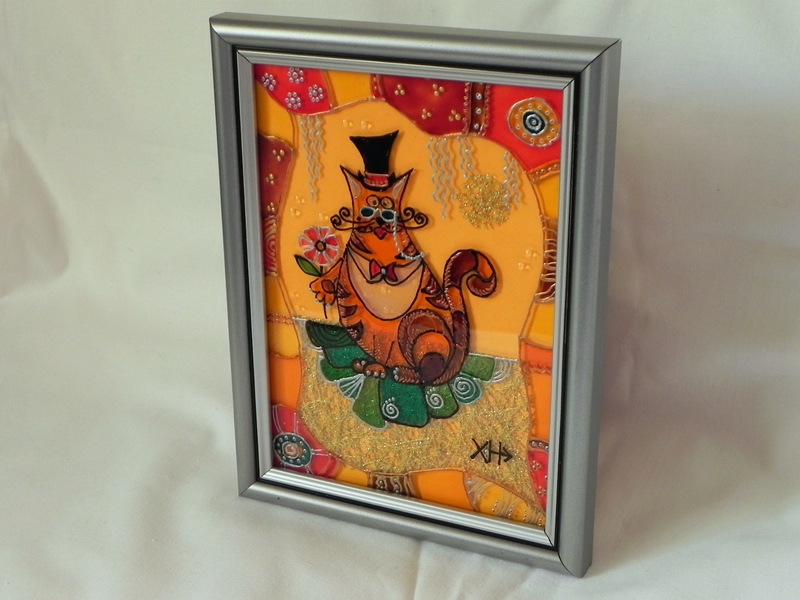 Серия «Кошкин Мир»: Денди. Размер живописного поля: 130 х 180 (мм) Витражная картина выполнена витражными красками и контурами по стеклу.Элегантный влюблённый английский кот в пенсне будет уместен как подарок для ценителей Европы и Великобритании в частности:) Для детей - это мифический персонаж. Возможный вариант: часть триптиха «Кошкин Мир» Современная рамка уверенно подойдет к любому интерьеру. На заказ. Срок – 7 дней. |