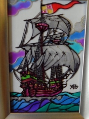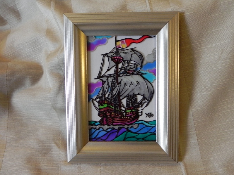 Размер живописного поля: 150 х 100 (мм). Серия «Парусники»: Каракка. Витражная картина выполнена витражными красками и контурами по стеклу. Кораблик-парусник времён открытия Колумбом Америки. Романтика морских странствий и открытий. Подарите себе или близкому человеку частичку мечты и моря. Серебристая рамка сочетается с синевой океана. |