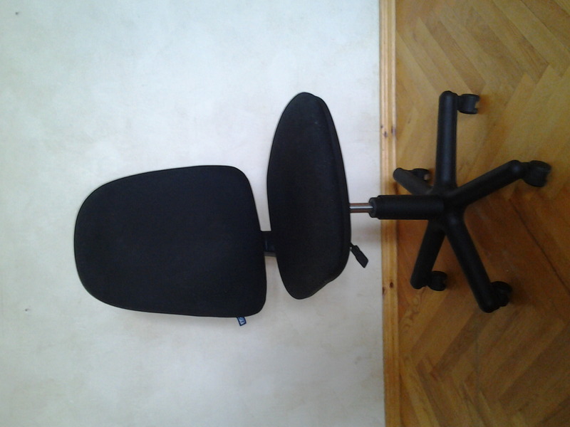 Стул офисный.Обивка черного цвета,немного потертая.но не критично.Колесики,крутящийся механизм-все исправно. |