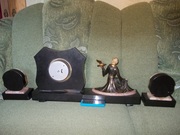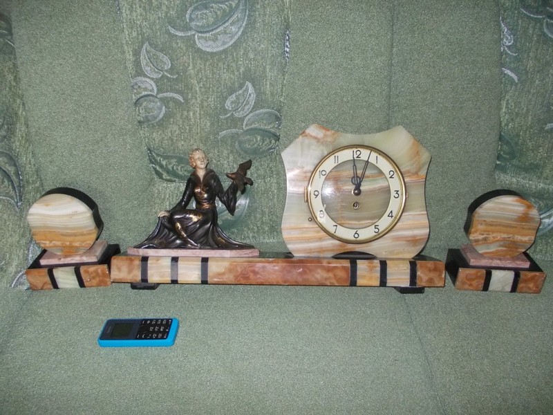 Каминный гарнитур арт-деко. Франция 20-30 годы 20 века. Материал оникс, сланец, айворин, бронза. Состояние хорошее, часы не на ходу. |