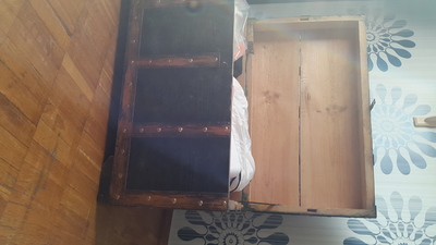 темно зеленого цвета деревянный сундук.происхождение,возраст и порода дерева неизвестны. |