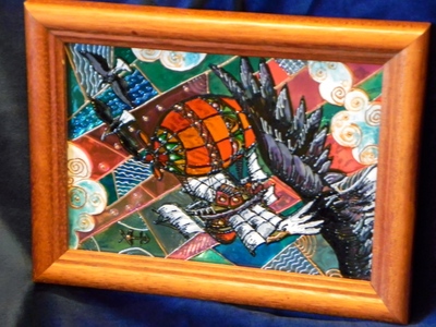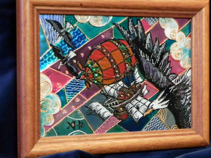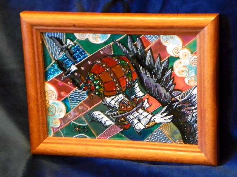 Серия «Зазеркалье»: Вместе с орлами Размер живописного поля: 130 х 180 (мм) Витражная картина выполнена витражными красками и контурами по стеклу. Необычное фольгированное стекло-основа даёт восхитительный оптический эффект яркого блеска изображения в отражённом свете! К сожалению, фото не передаёт этот феномен:( Только человеческий глаз способен оценить подобное. Фэнтези на тему летающих парусных кораблей в Параллельных Мирах. Любителям фэнтези будет хорошим и нетривиальным подарком этот сюжет. Деревянная рамка органично вольётся в привычный мебельный интерьер. |