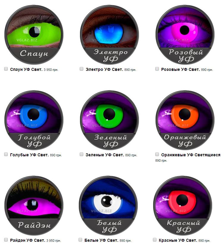 Цветные Линзы на Хэллоуин - супер возможность выделиться на Хэллоуин Пати или любой другой тематической вечеринке. Эти цветные crazy линзы не останутся незамеченными и точно выделят вас среди всех остальных, подчеркнут индивидуальность! Добавьте к цветным линзам минимум макияжа - и никакой костюм на Хэллоуин не сравнится с Вашим образом! Закажите линзы на Хэллоуин. Комбинация Цветные крези Линзы и макияж на Хэллоуин намного привлекательнее любого костюма на Хэллоуин. Ведь хороший костюм на Halloween стоит немало, но его не всегда можно оценить по достоинству в полумраке празднования Хэллоуина. Цветные Шокирующие Линзы за несколько минут помогут Вам создать лучший образ на Хэллоуин - просто выбирайте! Каким образ на Хэллоуин будет у парня? Это может быть Зомби, Вампир Дракула, Утопленник, Скелет, Психопат-убийца, или, например, Железный Человек, Человек-Паук, Супермен, Джек-Воробей. А кем будет девушка на Хэллоуин? Вариантов тоже много: Ведьма, Колдунья, Монахиня, Чертовка, Женщина-кошка, Ангелочек, или Добрая Фея. Решайте сами. Мы поможем Вам с карнавальными линзами на Хэллоуин!