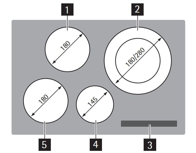 Левая ближняя зона нагрева: Индукционная, 1800 Вт/2300 Вт, O 140-200 мм