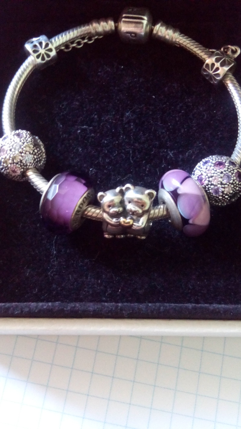 Оригінальний браслет Pandora. Довжина основи 17 см. В чудовому стані ,зовсім не розтягнутий,мною майже не носився. . Дуже ніжний і вишуканий. 925 проби. В комплекті : 2 кліпси, 3 намистин , одна з них у вигляді двох ведмедиків з сердечком і розділювач браслету (ланцюжок ) . Всі прикраси 100 % оригінал, 925 проби. В наявності також фірмова коробочка Pandora, серветка |