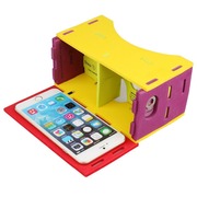 Разноцветная гарнитура виртуальной реальности для погружения при помощи смартфона, аналог Google Cardboard. Устройство разработанное компанией Google .inc, превращающие смартфон в шлем виртуальной реальности с возможностью отслеживания поворота головы. Надев его вы сможете увидеть гигантскую стереокартинку перед вашими глазами. Можно смотреть видео на YouTube,3d фильмы и при этом перед вашими глазами будет экран, такой же огромный как и в кинотеатре. Можно гулять по улицам при помощи Google Street View. Смотреть свои собственные Фоторафии и Фотосферы в 3D. Играть в игры, а так же попробовать виртуальные аттракционы, такие как Американские Горки имногие другие. ПО длягарнитуры вы можете скачать в магазине приложений для вашего смартфона. В зависимости от того на какой операционной системе работает ваш телефон.