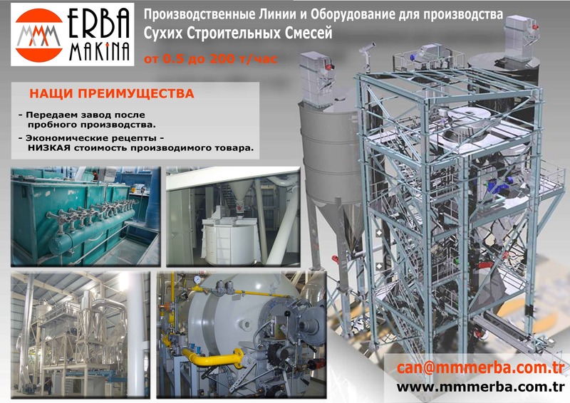АО МММ Эрба, в результате исследовании и разработки осуществленные своей группей разработчиков и их опыт в области технологического производства, производить и поставляет своим Клиентам производственные линии для производства Сухих Строительных Смесей с экономическим дизайном и с низкими эксплуатационными расходами, полные решения в производстве сухих строительных смесей, такие как полбностью автоматические линии и обоурдования, реконструкция и модернизация существующего завода в под-ключ, и разрабодка новых рецептов продукции (для снижения стоимость продукции).