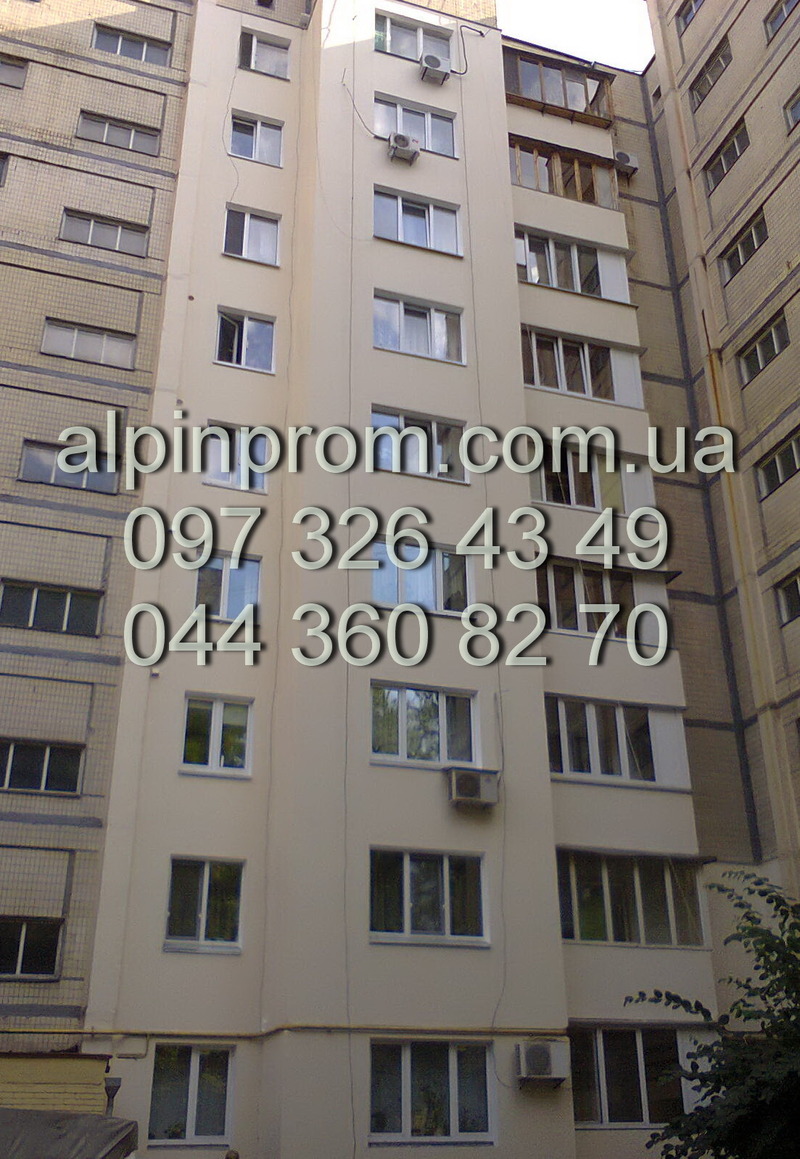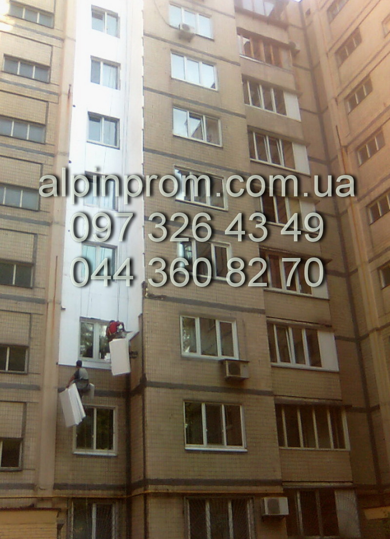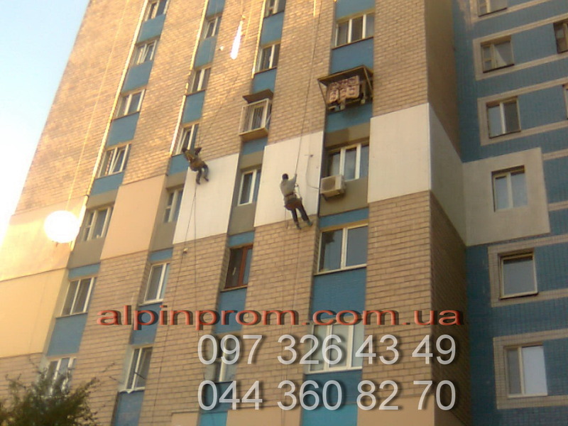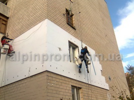 Высотное утепление проводится как с помощью метода промышленного альпинизма так и со строительных лесов.