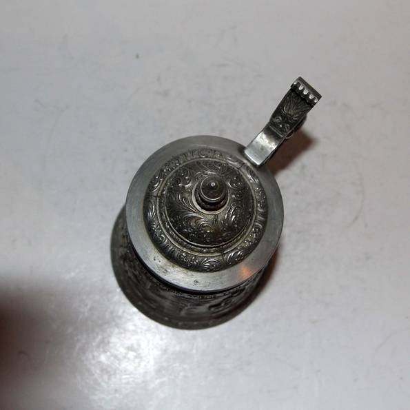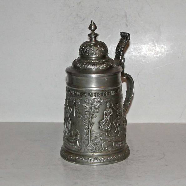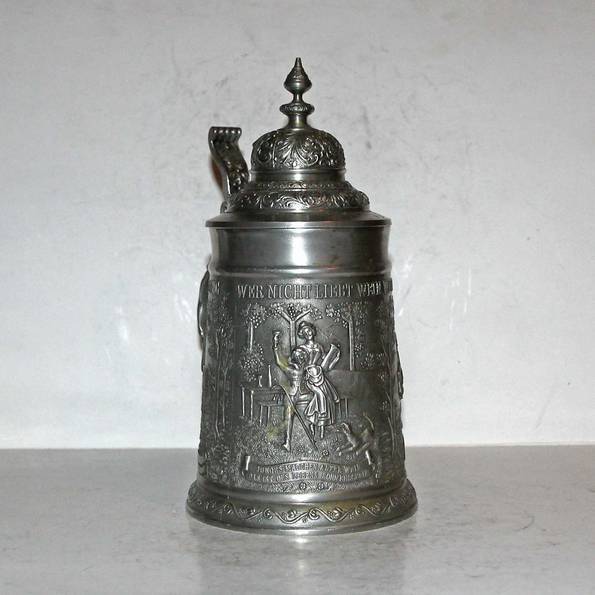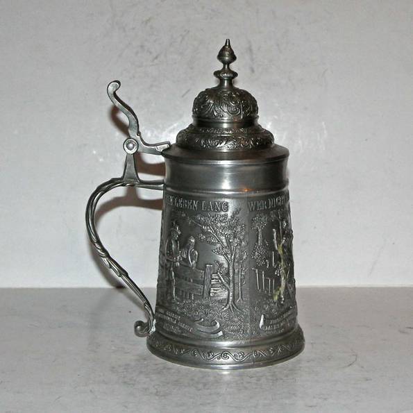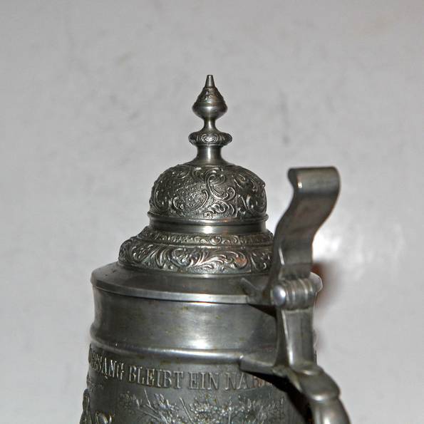 Исполнение - Stein mit Zinndeckel (с крышкой). Крышку можно удобно открывать с помощью большого пальца. Фигурная ручка, боковая поверхность, крышка и основание украшены растительным орнаментом.