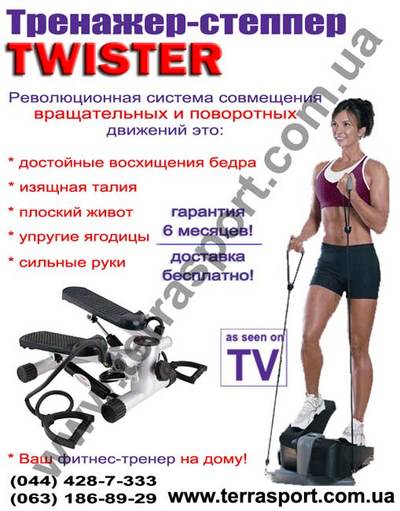 Степпер твистер - это уникальный компактный тренажер для достижения изящной талии, плоского живота, упругих ягодиц, достойных восхищения бедер и сильных рук. Вы тренируете мышцы и сжигаете калории одновременно.