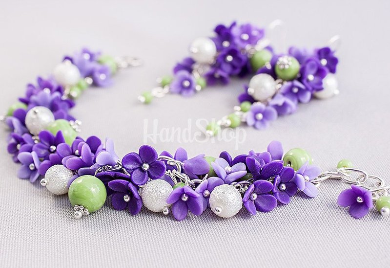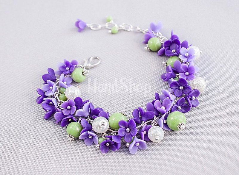 В комплекте: цветочный женский браслет — браслет из глины своими руками — браслет цветы на кисть размером 16 см + 5 см удлинительной цепочки. Женский браслет из цветов сирени в фиолетовом цвете с полимерной глины, керамических и стеклянных бусин |