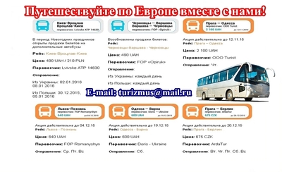 Продажа билетов на международные автобусные рейсы по всей Европе - Польша, Франция, Бельгия, Россия, Молдова, Чехия, Болгария и т.д. Новые рейсы, акции и скидки от перевозчика. Удобно, быстро, комфортно, недорого - путешествуйте вместе с нами! |