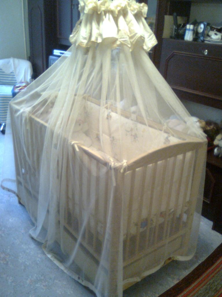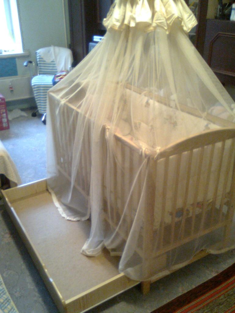 В комплекте постель из 100 % хлопка (ортопедический матрац на основе кокосового волокна, кокосовой стружки, защитная мягкая обивка по периметру кроватки, простынь, пододеяльник, одеяло, подушка, балдахин (москитная накидка с регулируемой стойкой.) Высота кроватки регулируется по высоте на 3 (три) уровня. Кроватка полностью разбирается на все отдельные детали и элементы конструкции. Внизу кроватки есть выдвижной ящик на роликах и горизонтальных направляющих для постельных принадлежностей, а также для детских вещичек.
