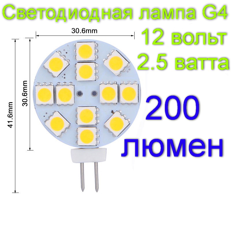 Светодиодная Led лампа G4 2W, 200 Lm, 12V Лампа состоит из 12 мощных диодов 5050 Led smd, Мощность 2W, Световой поток 20 Lm, Xолодный белый 5000К. Размер Ø30mm, толщина 4mm, длина с ножками 42mm. http://led-ua.at.ua/index/lampy_led_g4/0-7 |