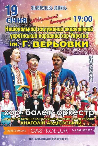 СВІТ АПЛОДУЄ ЇМ СТОЯЧИ! ГОРДІСТЬ УКРАЇНИ! 19 СІЧНЯ У ЛЬВІВСЬКІЙ ОПЕРІ НАЦІОНАЛЬНИЙ ЗАСЛУЖЕНИЙ АКАДЕМІЧНИЙ УКРАЇНСЬКИЙ НАРОДНИЙ ХОР УКРАЇНИ ІМЕНІ ГРИГОРІЯ ВЕРЬОВКИ. Зачарує серця шанувальників наймайстерніше виконання пісень, найграціозніші й найпрекрасніші танці хореографічної групи та віртуозна гра оркестру народних інструментів - і все це Національний український народний хор імені Григорія Верьовки. Віддавна славиться Україна піснями, оксамитовими голосами і через те, певно, зовуть її солов'їною. Найкращою візитною карткою, що понад 70 років несе у широкий світ пісню-сповідь, пісню - думу, пісню - душу, - є Національний заслужений академічний український народний хор України імені Г.Верьовки. Зачаровує, найпотаємніших струн серця торкається кришталево - дзвінка, задушевна, п'янка і ніжна українська пісня. А саме з таких і складається репертуар славетного колективу. І линуть пісні, розлягаються над світом, збуджують прекрасні почуття і благородні поривання, несуть людям радість. Однак не лише з радості народжується пісня. Так само тримала вона на своїх крилах, не давала впасти у безнадію й у часи кривавих лихоліть. Біль і тугу виливав народ співом - і з піснею відходили відчай, зневіра, втома. Хор Верьовки - небачене видовище. Ми нічим не ризикуємо, стверджуючи, що перед нами - диво, яке заворожує наш слух і зір. Не знати чому віддати перевагу - бездоганному хору, дивовижним танцям, віртуозному оркестру чи пречудовим костюмам. Це не спектакль, а дивний сон, зміст якого становлять нечувані звуки, небачені рухи і неземні кольорові гами. Вони викликають беззастережне захоплення всіх присутніх, що триває протягом концерту. Уявіть собі, найпрекрасніший парад, учасники якого одягнені в найбагатші костюми, найвимогливіше і наймайстерніше виконання пісень, найграціозніші й найпрекрасніші танці - і тільки тоді ви зможете зрозуміти, що відбувається на сцені завдяки цим артистам. ЖИВИЙ ЗВУК! НЕ ЗВОЛІКАЙ! НЕ ПРОПУСТИ КРАЩУ МИСТЕЦЬКУ ПОДІЮ РОКУ! КВИТКИ ВЖЕ В ПРОДАЖІ! Різдвяні концерти Львів 2016 - хор імені Григорія Верьовки. www.gastroli.ua