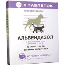 Применение: таблетки альбендандазола с запахом и вкусом говядины предназначены для профилактики и лечения желудочно-кишечных и легочных нематодозах, некоторых цестодозах и трематодозах собак и котов.