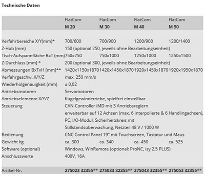 FlatCom M20; M30; M40; M50 Ход по осям ( X / Y ) (мм): 700/600; 700/900; 1200/900; 1200/1400 Z lift [mm]: 150 (опционально 250) Bench clamping area W × D [mm]: 750x750; 750x1000; 1250x1000; 1250x1500 Z gap [mm] *: 200 (optional 300) Габариты (ШхВхГ, мм): M20 1420x1150x1870 M30 1420x1450x1870 M40 1920x1450x1870 M50 1920x1950x1870 Скорость перемещения, мм/сек: макс.250 Точность повторения: ± 0.02 Тип привода: Сервомотор Управление: ПК с сенсорным дисплеем оператора 19”, клавіатура, мышь Вес (кг): ~300; ~340; ~450; ~525 Програмное обеспечение Windows, WinRemote (опция: ProNC, isy 2.5 PLUS) Подключение: 230 V, 16 A; 400 V, 16 A; 400 V, 16 A; 400 V, 16 A |