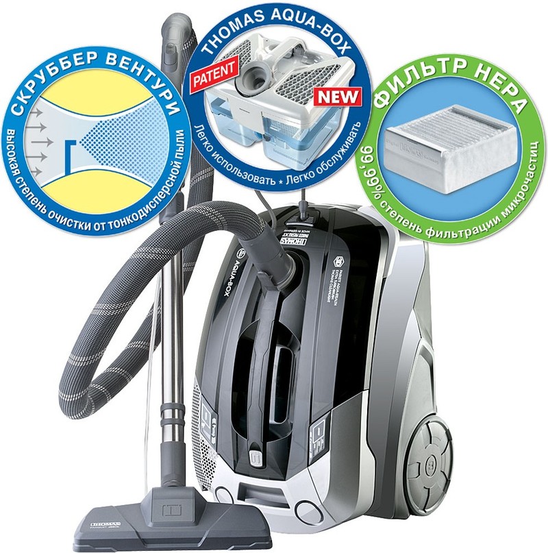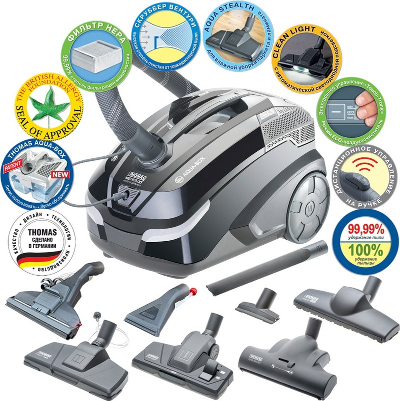 Сделанный в Германий безмешковый пылесос для сухой и влажной уборки паркета и ламината THOMAS PARKETT PRESTIGE XT . Инжекционная система водяной фильтрации Aqua-BOX (уровень фильтрации 99,99% , удержания пыли и 100 % - пыльцы). Идеален для аллергиков. Функции: сухая уборка с инжекционной водяной фильтрацией с системой Aqua-BOX; деликатная мойка паркета и ламината, исключающая повреждение напольного покрытия; экстренный сбор жидкостей. Мощность – 1700 Вт Радиус действия -12м Качественный пылесос, простой в эксплуатации. Максимальный комплект насадок. |
