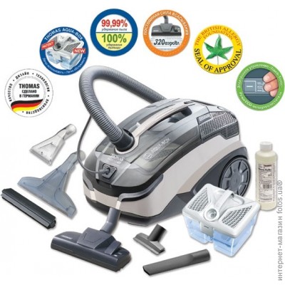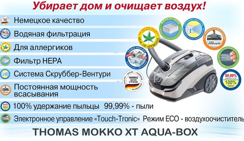 Сделанный в Германии моющий пылесос с инжекционной водяной фильтрацией THOMAS Mokko XT Aqua-Box. Уровень фильтрации 99,99% , удержания пыли и 100 % - пыльцы). Пыль, пыльца и другие аллергены вместе с грязью оседают в воде, не попадая обратно в воздух, а неприятные запахи полностью нейтрализуются. 100% чистота и свежесть воздуха. Просто использовать – залить 1 л. воды. Просто обслуживать – после уборки долить воды встряхнуть и вылить в унитаз. Идеален для аллергиков. Функции: сухая и влажная уборка полов, ковровых покрытий и мягкой мебели, экстренный сбор жидкостей. Минимальная остаточная влажность в режиме влажной уборки. Постоянная сила всасывания 320 АэроВТ. Электронное управление. Режим ЕСО – воздухоочиститель. Имеет сертификат Британской Ассоциации Аллергологов!