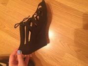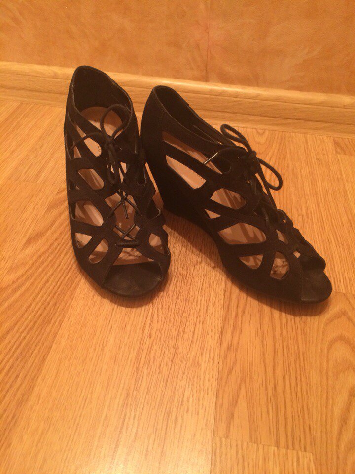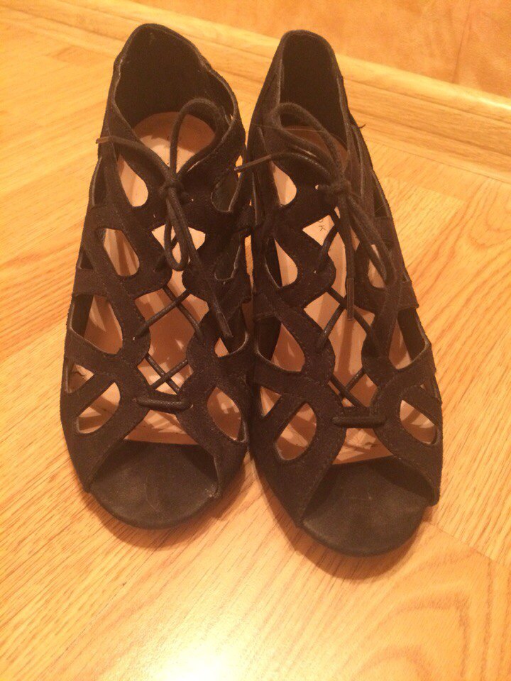 Удобные, красивые , замшевые черные босоножки new look на маленькой танкетке , из за того что они на маленькой танкетке, ваши ножки не устанут к концу дня,но так же они сделают ваши ноги визуально длиннее. 36 размер, носились - 3 раза ! Для более подробной информации звоните, пишите смс/viber |
