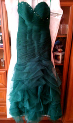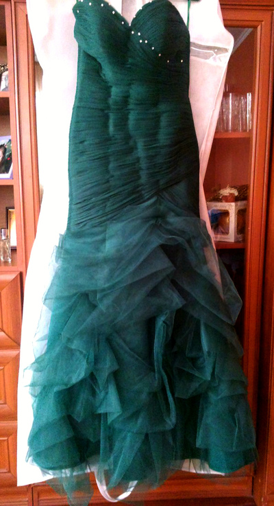 В живую цвет на много насыщенней ,очень красивый цвет, но мой планшет этого не передает. Шикарное зеленое платье. Стиль-рыбка . Максимальный размер груди- 98 ,максимальный размер талии- 76 ,но оно подходит и на размеры меньше ,сзади молния и шнуровка ,можно затягивать до нужного размера. У меня талия 60 ,хорошо затянули сзади и было отлично. Покупала в салоне на выпускной. Покупая его,можете быть уверены ,что такого больше ни у кого не будет ,так как ,оно шилось в единственном экземпляре в зеленом и в красном цвете. Сверху камни Сваровски и снизу немного ,но на фото не видно . Одевалось один раз на выпускной, состояние ,как новое. Очень красивое на теле.Этот фасон рыбки подчеркнет все достоинства вашей фигуры. Чехол в подарок